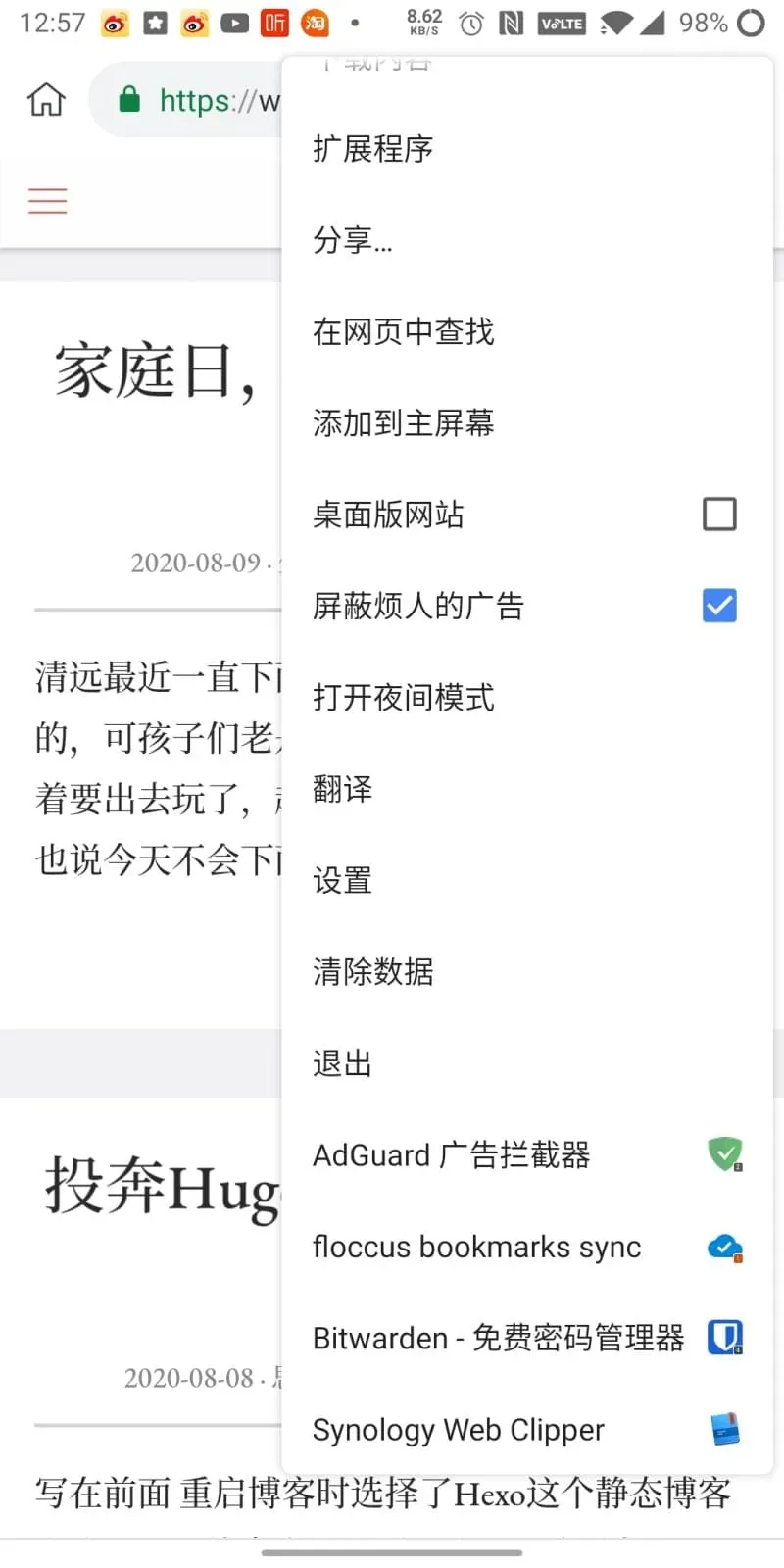 Kiwi Browser 就是一款支持 Chrome 线上应用商店的手机浏览器,我在上面也安装了 Synology Web Clipper,Bitwarden。这样我在手机上也能将要记住的页面资料保存到 NAS 和使用 NAS 上的密码仓库功能了。